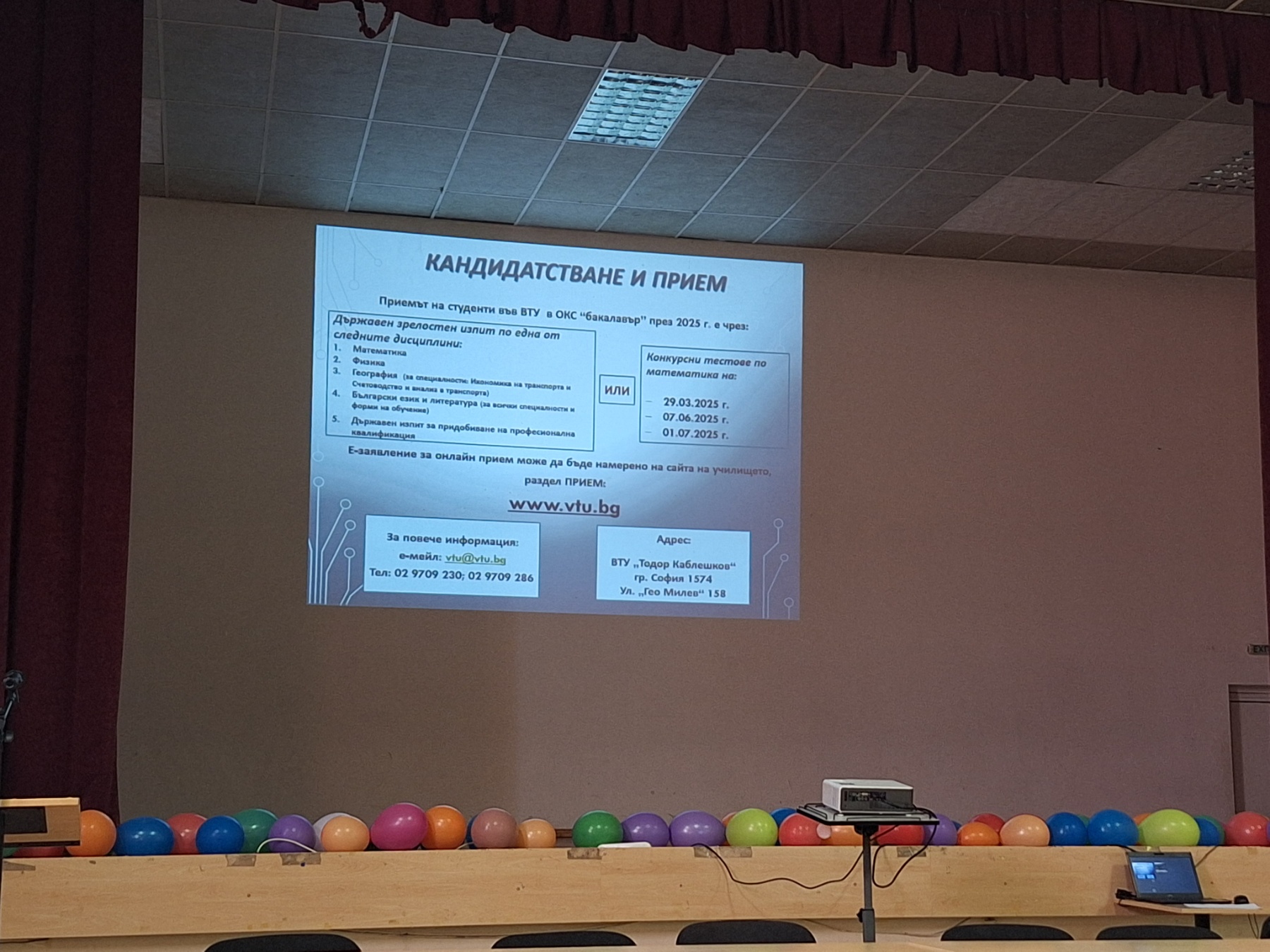 В зала „Юбилейна“ се проведе среща, на която ръководството на университета представи информация за специалностите, условията за кандидатстване и възможностите за бъдеща реализация. Участие взеха доц. д-р инж. Юлия Варадинова – зам.-ректор по учебната дейност, проф. д-р инж. Георги Павлов – декан на факултета по транспортна техника, доц. д-р инж. Миряна Евтимова – декан на факултета по икономика, както и други преподаватели и ръководители на катедри.
